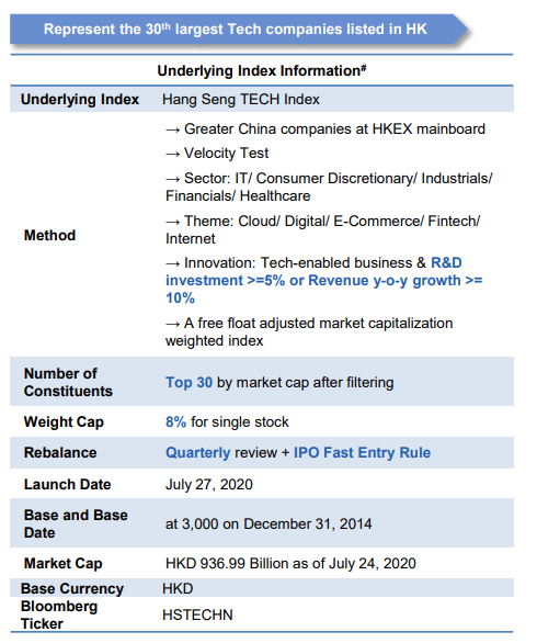 Hang Seng TECH Index, launched by Hang Seng Indexes Company Limited on 7 July 2020, represents the 30 largest technology companies listed in Hong Kong that have high exposure to technology themes, which are Internet (including Mobile), FinTech, Cloud, E-commerce and Digital. The launch of Hang Seng TECH Index, which was called “NASDAQ of the East”, has drawn wide market attention.