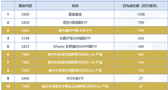 南方东英是香港知名的ETF发行商,在产品发行和创新上一直走在市场前沿。2018年初至2019年底的两年间,香港前十大最活跃成交ETF/ETP排名中,有一半的产品由南方东英管理,可见南方东英实力强劲。